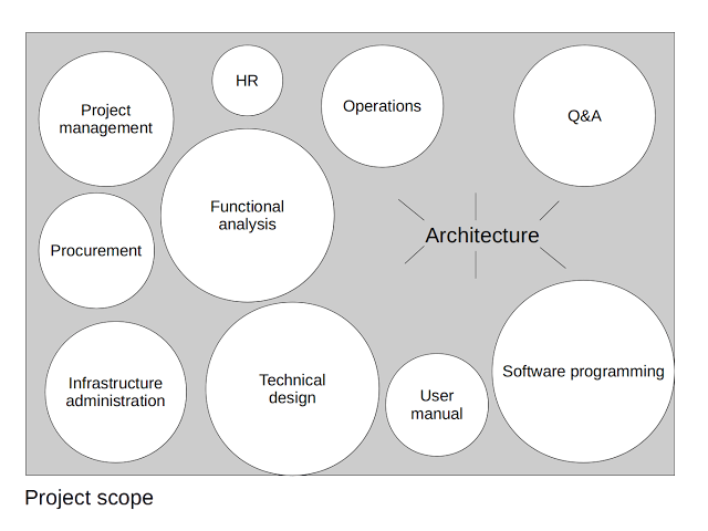 In my vain attempt to define the role of an architect I tried to define other roles I felt more familiar with, but no matter how hard I tried, I never could do it without referring to a further role: a programmer implements the technical design in source code, a functional analyst documents business processes as dictated by the application owner… you get the gist. Assuming that every role in the project is highly specialized and optimized, the only person that makes sure everybody is talking to the right counterparts and that processes are working is the project manager – but that role is often not technical enough to deal with anything that comes after functional analysis, and that’s where the architect steps in.