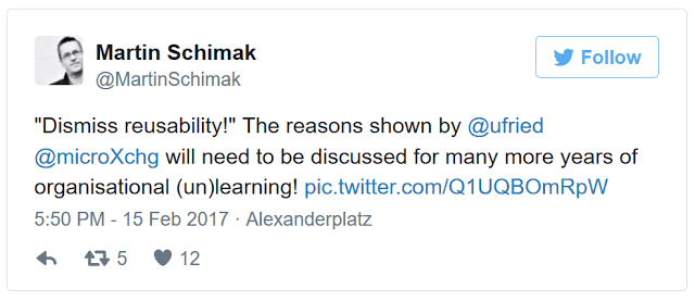 I have previously written about reusing functionality [1] in the micro service context and found then that the old aim to optimise code footprint is a metric in need of a good overhaul. Ever since I’m happy that the idea is getting traction: