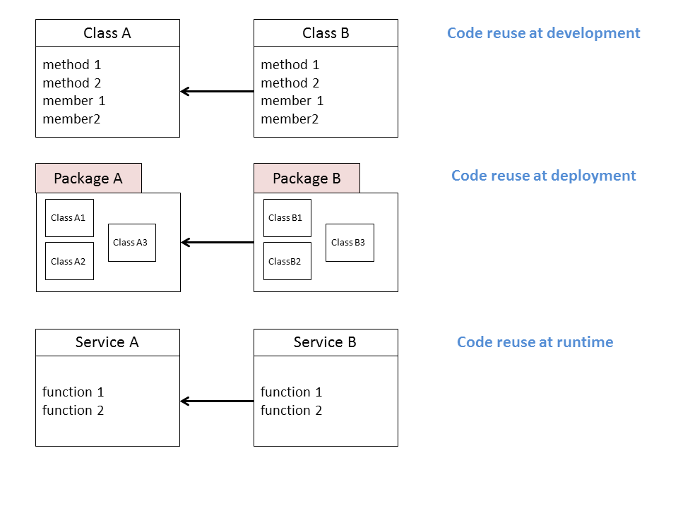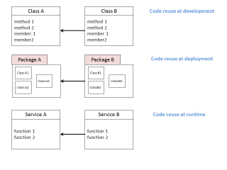 By looking at the software development life cycle from development to deployment to operation we’ll notice a change in granularity of function reuse: the development phase is governed by the single responsibility principle [4] which mandates that a particular functionality is located in a single class, so functional granularity equates class granularity. During deployment, code is packaged into libraries or even larger deployment artefacts such as EAR files; functional granularity now grows towards including multiple classes. Finally, applications communicate at runtime with other applications through I/O channels (such as a network) which enlarges functional granularity to encompass entire applications or even application clusters (think about fail-over or load balancing).