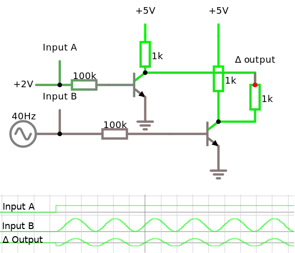 Most implementations I found essentially feed the two input signals to two emitter follower circuits and compare the outputs. The idea is quite simple and effective, but with one huge caveat: the measured difference is relative to the voltage levels at the collectors of the two transistors and cannot be translated as a single value relative to the circuit’s ground. If we wanted to use this circuit like the ideal differential amplifier we’ve discussed earlier, the circuit making use of the output difference would have to base it’s ground at the collector of one of the two transistors. Doing so would cause many problems, starting with a much reduced operation voltage for the follower circuit, reduced power and possibly noise. Not to mention, this differential amplifier is a linear (or so) amplifier, far from the ideal 0/1 discriminator I’m after.