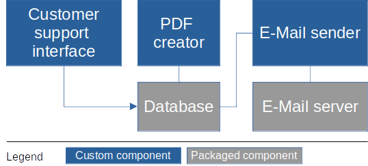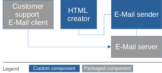 Humility: the design relies on packaged components which probably already exist and it only minimally invades the existing IT landscape. It reuses high quality packaged solutions (e-mail server, e-mail client) which may already exist in the organisation and reduces implementation tasks to e-mail server and e-mail client configurations. The traditional delivery method places several requirements on how the solution is built: it mandates formal APIs, probably a particular technology platform, a pre-defined method according to which components are structured (eg. SOLID), technical documentation and thorough test automation long before it is clear that the project will make it into production, but nevertheless increasing conceptional and real complexity of the solution and the delivery process and requiring an increased skill set for project participants.