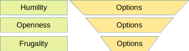 Frugality is about risk management: reducing upfront costs now allows exploring more value propositions and solution approaches now while spending resources later on improving the solution. A low cost incurred early jeopardises a project less than a large cost incurred at the same time, especially if whatever that cost bought us turned out to be the wrong thing. Frugality is a holistic view on the patterns guided by Openness – it takes into consideration synergies between options and maximises value, both in terms of business value created for the solution (how many of the requirements were implemented at what effort) as well as value added to the project delivery (how much delivery and quality was improved, what was learned etc).