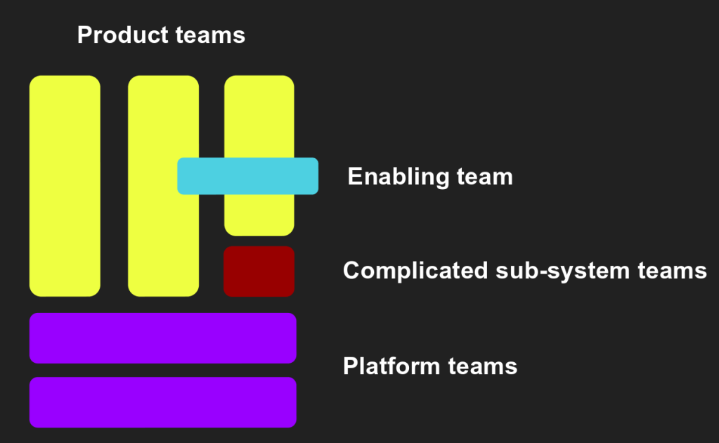The team topologies organisational structure improves the Spotify model because it enforces a growth constraints on teams: the domain a team works on must fit in everybody’s head. Once the domain complexity increases beyond an individual’s understanding, the domain must be partitioned into multiple teams. This constraint on team size forces teams to collaborate with each other. The Spotify model promotes collaboration through the vaguely defined chapter which is largely based on volunteering and thus more or less optional, while team topologies enforce collaboration by making it mandatory for everyone: stream-aligned teams must trim their domains by offloading complexity to the platform team, new stream-aligned teams or specialised complicated sub-system teams, the enabling team proactively identifies topics for improvement and implements them through its do-don’t-tell mentality and the platform team’s job security is tied to the services it offers to other teams.