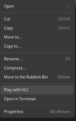 I’m missing, dearly, the “Play with VLC” context menu entry in Ubuntu 24.04. There’s a cumbersome workaround(open -> with -> *scroll scroll scroll* -> VLC), but I want something faster. What started as a side quest for some convenience eventually taught me how to add arbitrary functionality to Ubuntu’s file manager context menus.